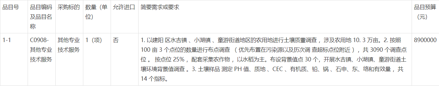 项目名称:建阳区水吉镇、小湖镇、童游街道耕地土壤环境质量调查项目服务类采购项目 采购方式:公开招标 预算金额:8900000元