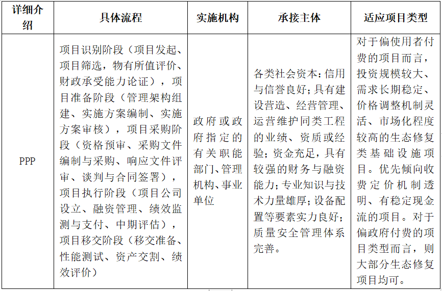 PPP模式是政府与社会资本合作的项目模式,具体是指政府部门通过招标与中标单位组建项目公司,在特许合同约定的期间内由项目公司负责具体建设工作及后期运营,在特许期结束将项目转交给政府部门的运作模式。PPP模式的显著特点在于社会资本的参与,这类模式下各类社会资本均可以参与生态修复领域的建设运营,有助于拓展资金来源、提升生态项目资金的利用效率和相关设施的运行效率。双方风险划分可通过协议约定,分散了政府的部分投资风险。但缺点在于项目关联方较多,组织机构设置较为复杂,且在建设和运营过程存在较多不确定因素。