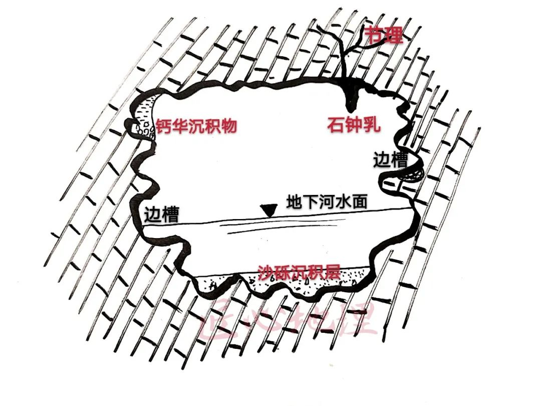 溶洞两侧边壁有边槽,它标志地下河水面变动时的位置,这里溶蚀侵蚀作用也较强烈,故形成向洞侧凹入的槽状地貌。