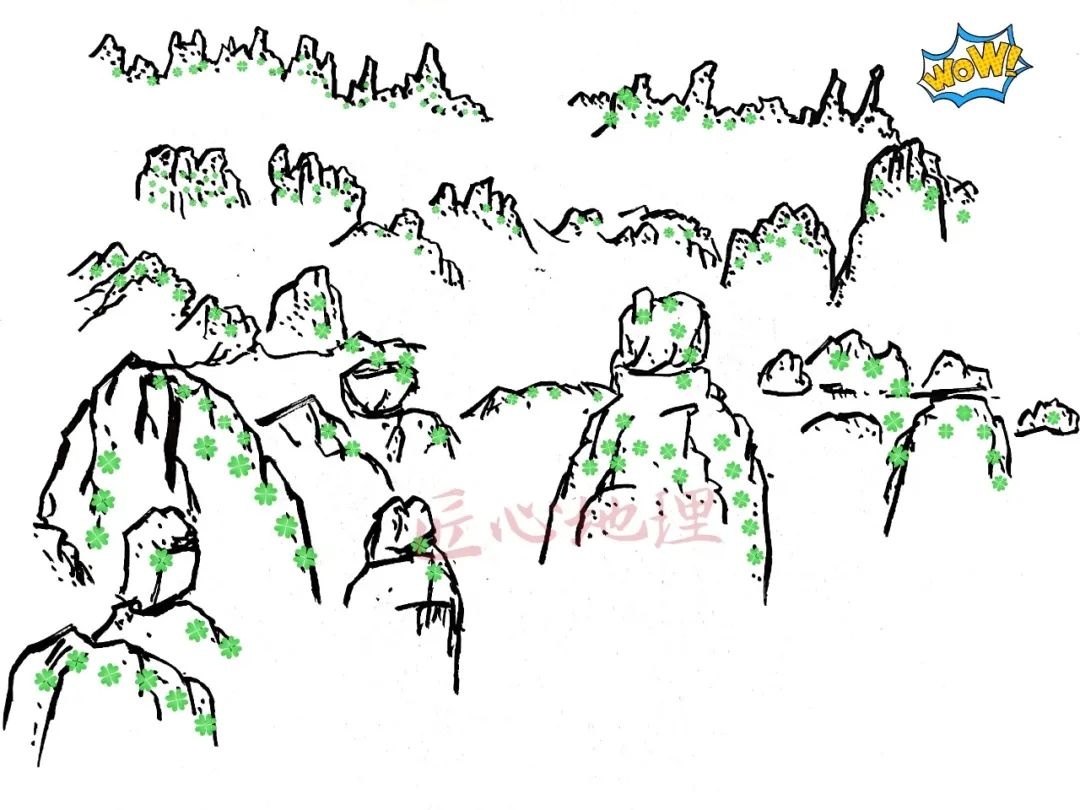 峰丛:岩溶地区发育的基部相连,且相连部分高度比例大于上部分开部分的山峰群,相对高度在200-300m。