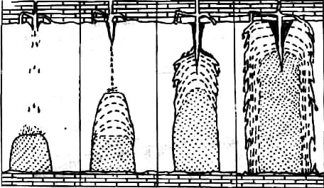 有时下渗水中含有其他杂质或者中央通道上 水滴的晶体生长,通道由此被堵塞。以后,下渗水继续往石钟乳外部流动与堆积,石钟乳不断增大,它的横切面具有同心圆结构。如果石钟乳附近有多个水滴堆积时,则形成不规则的石钟乳。