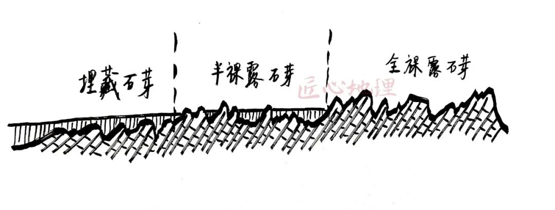 通常,从山坡上部到下部,由全裸露石芽过渡为半裸露石芽至埋藏石芽,如下图: