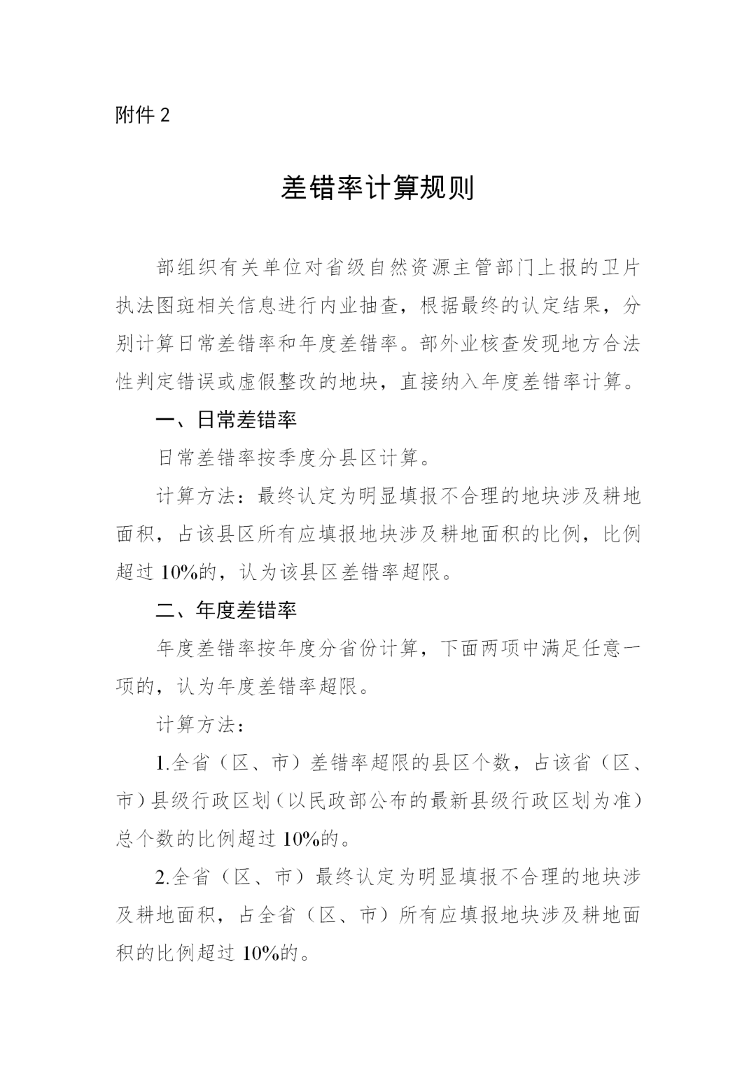2.明确差错率评估方法。部组织有关单位采用内业抽查和“互联网+”在线核查的方式,对省级上报的“月清”图斑数据开展内业抽查工作,重点抽查“新增非农建设类”“年度内持续变化类”图斑。对部内业审核不通过的图斑,应于退回之日起,经省级自然资源主管部门组织复核纠正或重新举证后,按“月清”时限要求报部。部将进行内业复核,并根据最终的认定结果分别计算日常差错率和年度差错率(详见附件2)。