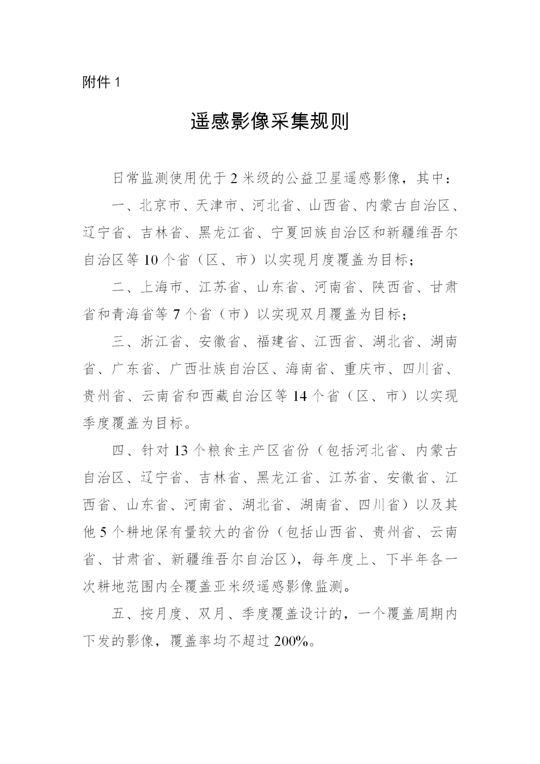 1.加强遥感监测。部组织有关单位按照相关要求,将不同省份的遥感影像覆盖周期分为“月度覆盖”“双月度覆盖”“季度覆盖”。一个覆盖周期内,下发的遥感影像覆盖率不超过200%。另外,针对13个粮食主产区省份和5个耕地保有量较大省份,实现年度内上、下半年各一次耕地范围全覆盖亚米级遥感影像监测(详见附件1)。对长期未能采集到光学卫星遥感影像的地区,探索采取雷达卫星、无人机等方式补充监测。