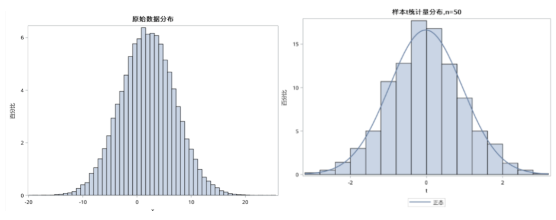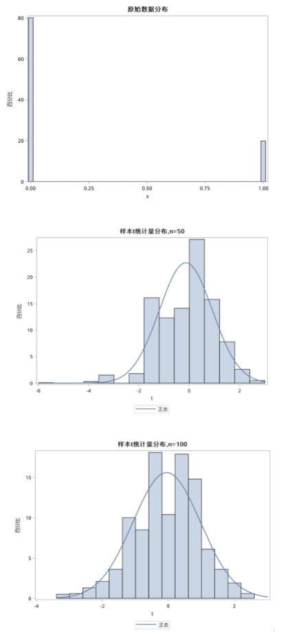 那么到底哪种说法正确呢?样本量较大时是否还要求数据服从正态分布呢?其实这个问题在统计学专业的教材中有非常明确的数学证明,数据不满足正态分布时,也是可以使用T检验的,但不完全是因为中心极限定理。(本文附录将介绍统计学教材中对该问题的数学证明,建议先看文末的附录再看结论)