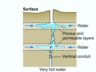 炽热的熔岩使周围地层的水温升高,化为水汽,这些水汽沿岩石层的垂直裂隙上升,当温度下降到汽化点以下时就凝结成为温度很高的水。这些积聚起来的水,还有地层上部的地下水同时混杂有蒸汽沿地层裂隙喷射流冒到地面。每间隔一段时间就会喷发一次,从而形成了间歇泉。