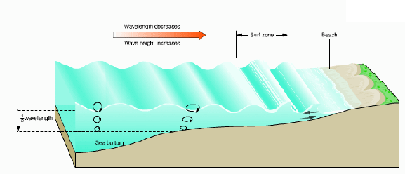 波浪由深水区传入浅水区,波形发生变化。深水区是波长恒定的波形,波浪做圆周运动;浅水区受到水底边界的影响,波浪做椭圆运动。
