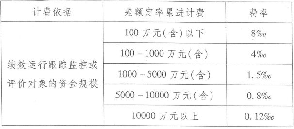 全咨单位参与预算绩效管理服务取费可参考地方收费标准,如湖北省地方标准——《湖北省财政厅关于印发<湖北省第三方机构参与预算绩效管理工作暂行办法>的通知》(鄂财绩规〔2014〕3号),绩效运行跟踪监控和绩效评价全部委托服务采用计件收费方式的,以绩效运行跟踪监控或评价对象的资金规模为计费依据。