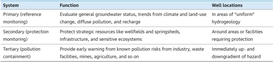 一个良好的地下水质量监测系统包括一个由监测点、实践和熟练人员组成的网络,必须与地下水水位、抽提和排泄的监测相结合。不同的机构为不同的目的进行监测,但目标应该是建立一个总的监测网络,即所有机构网络的混合体。单个监测网络的目标包括: